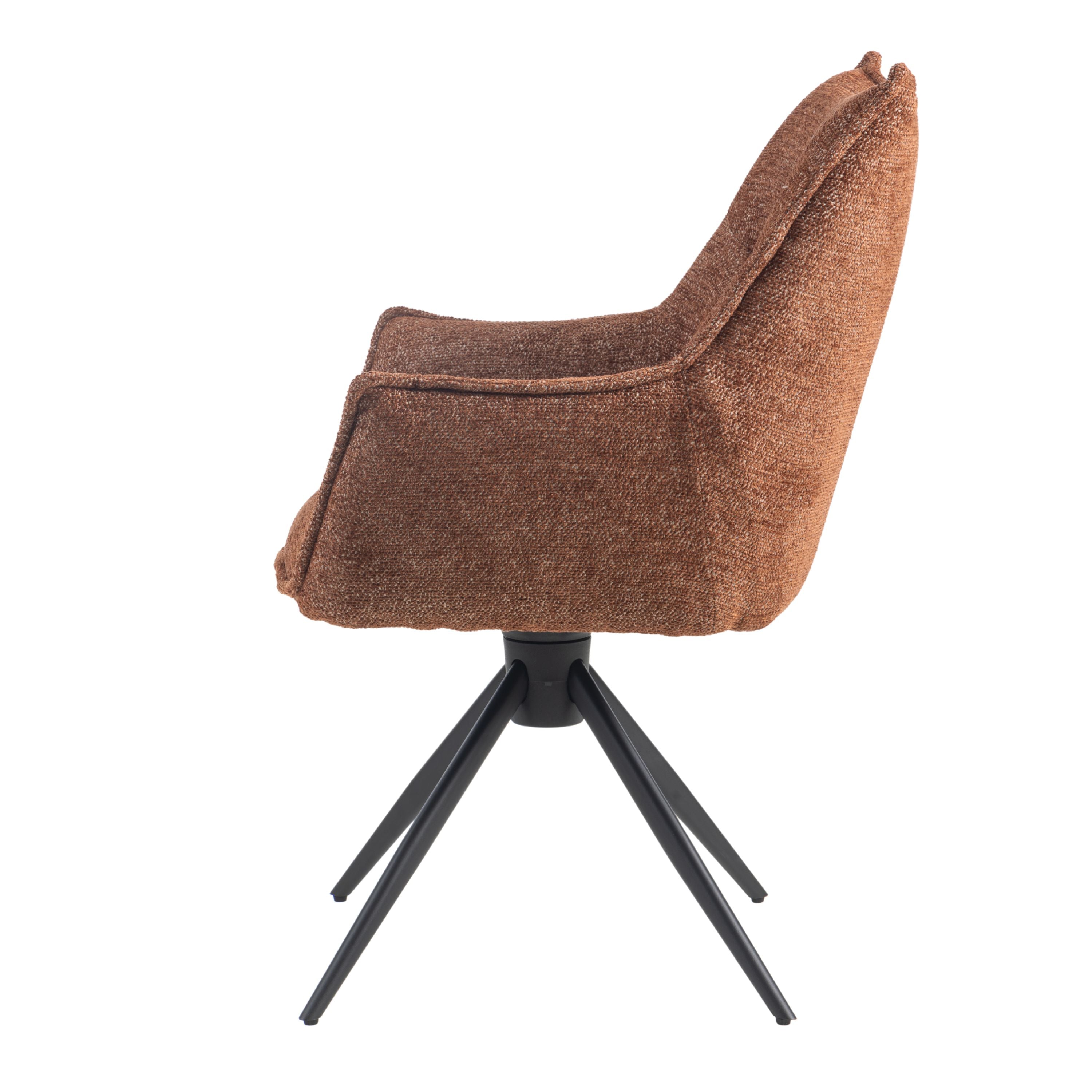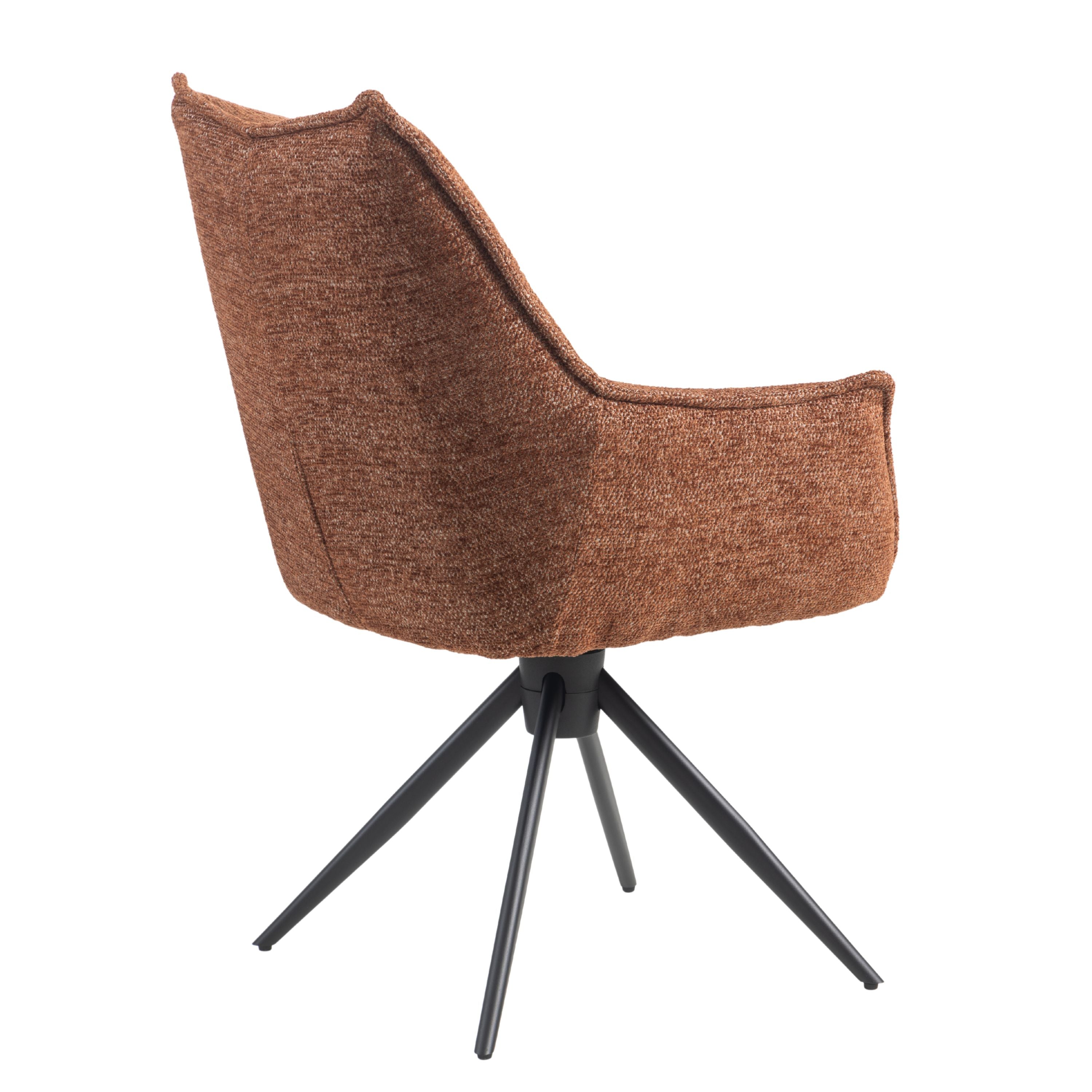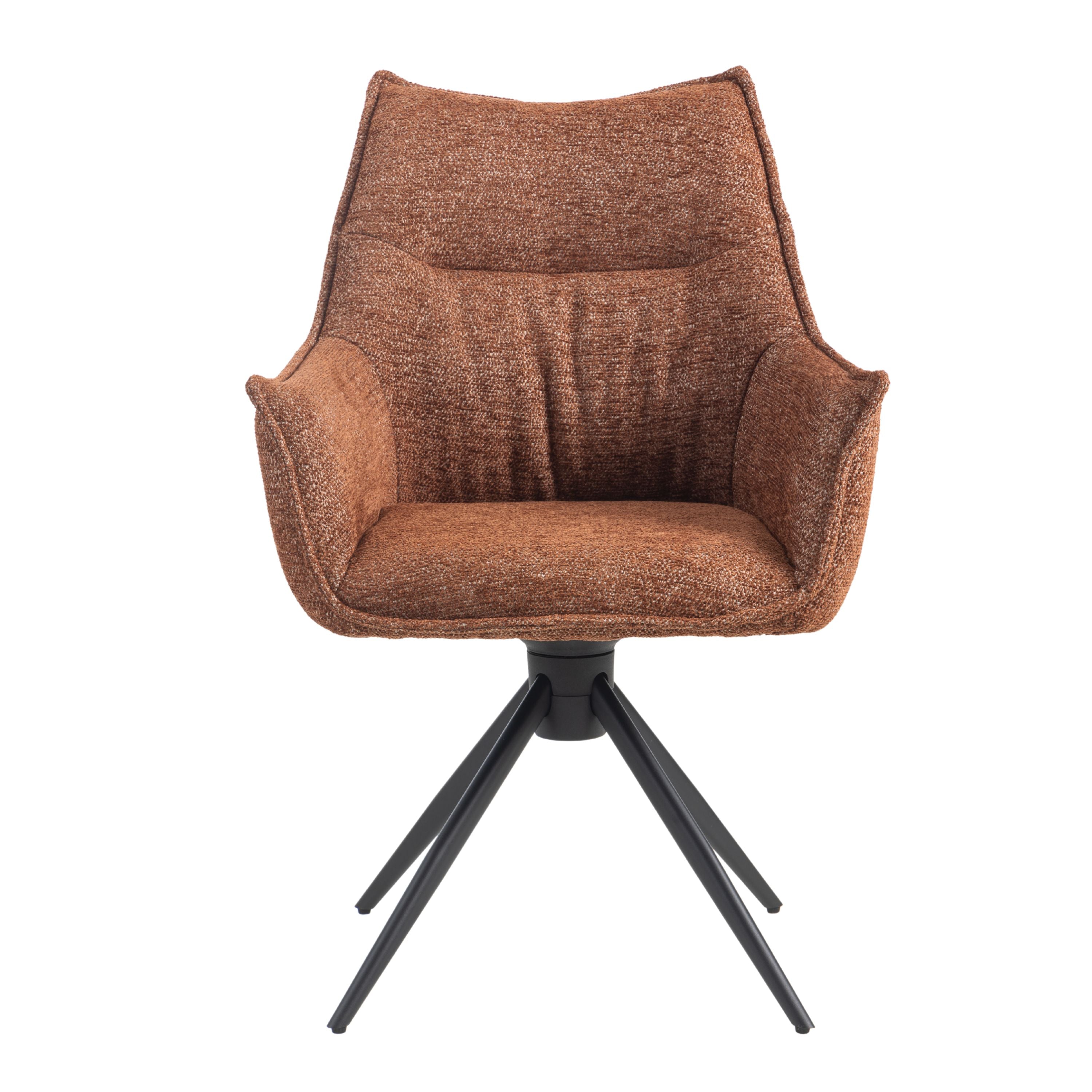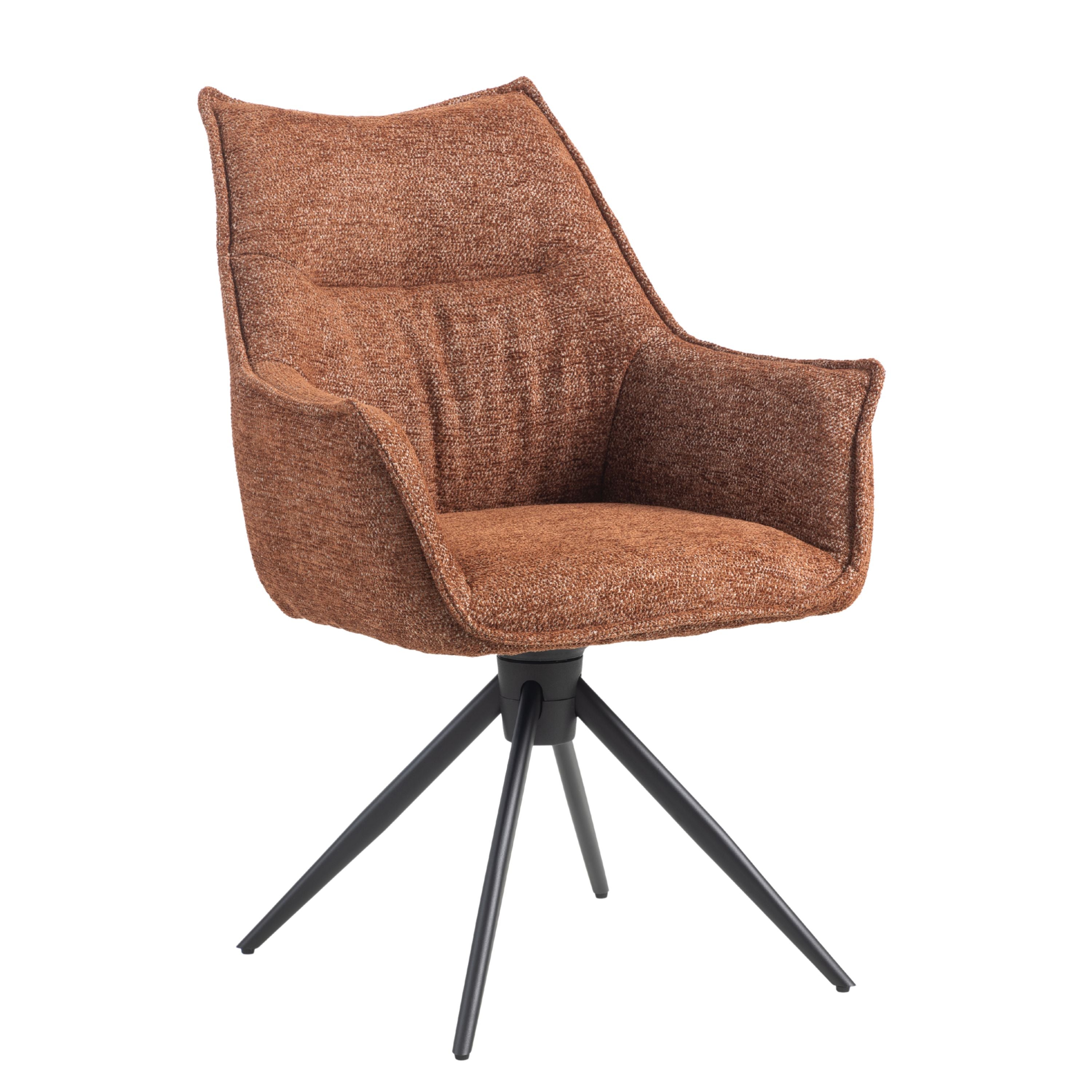 Eetkamerstoel Floris is een moderne draaibare eetkamerstoel met zachte geweven stof, comfortabele vulling en zwarte stalen draaipoten. 180° draaibaar en verkrijgbaar in Beige, Groen en Tan/Terracotta.