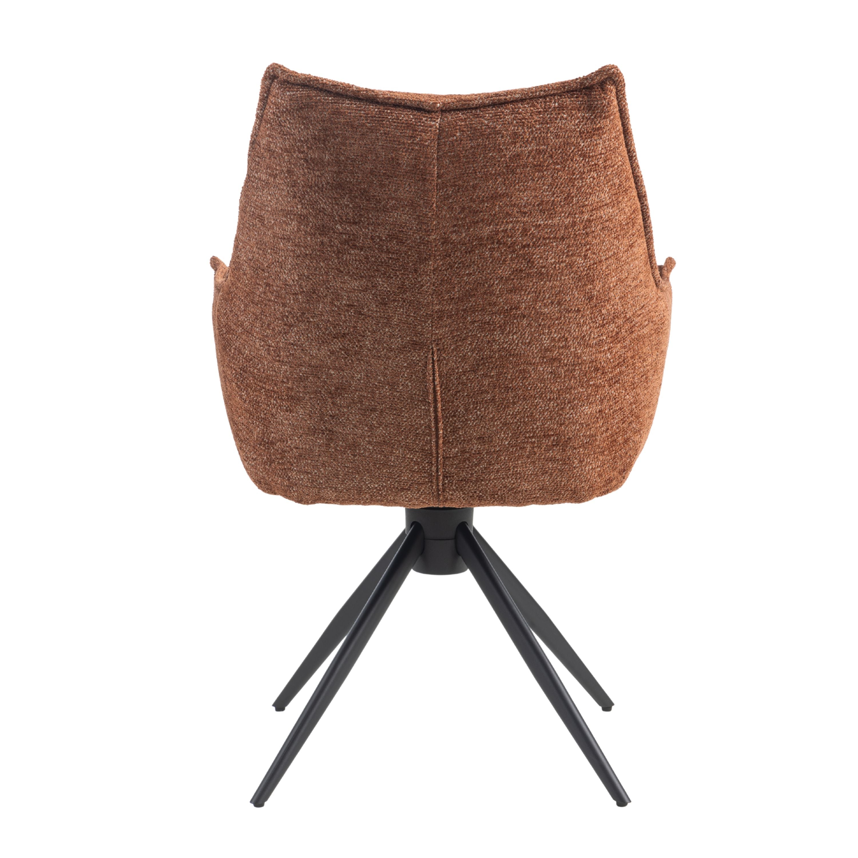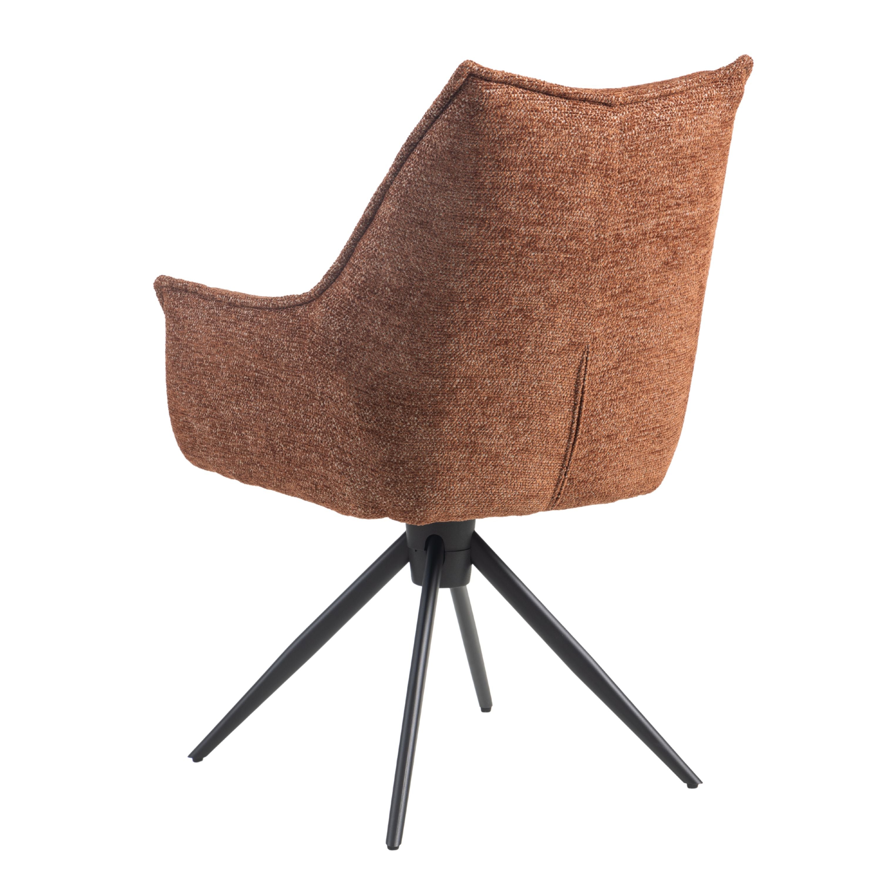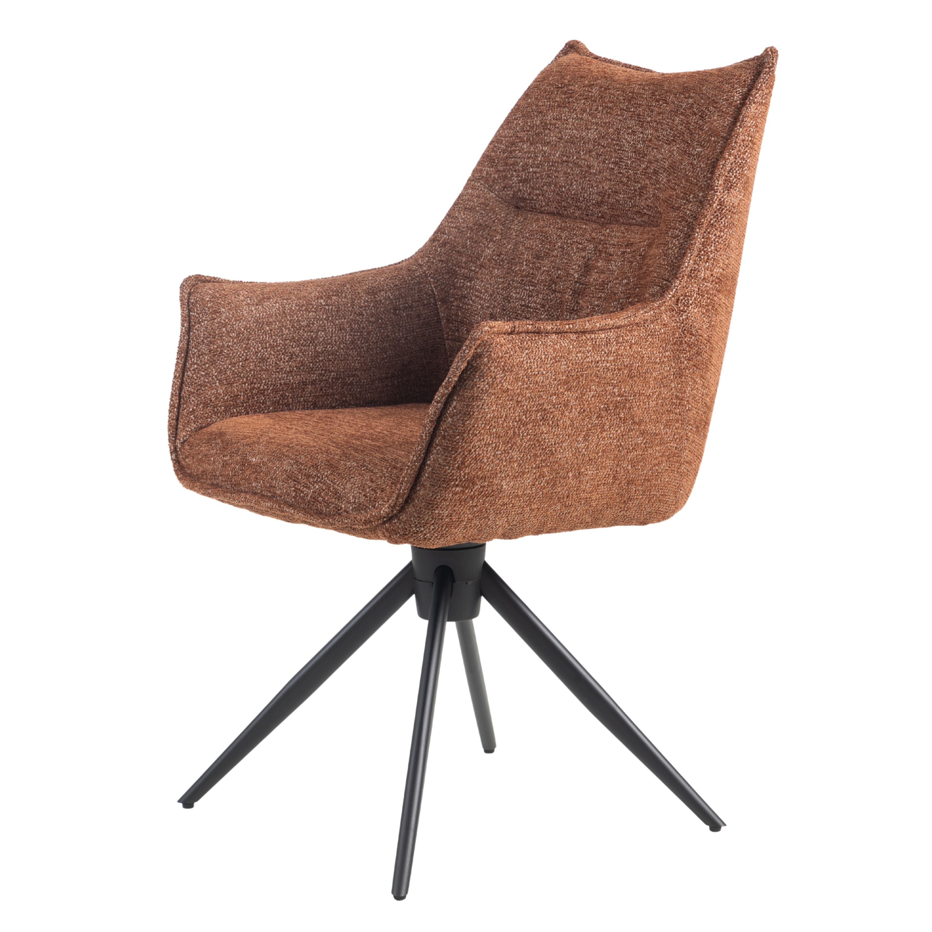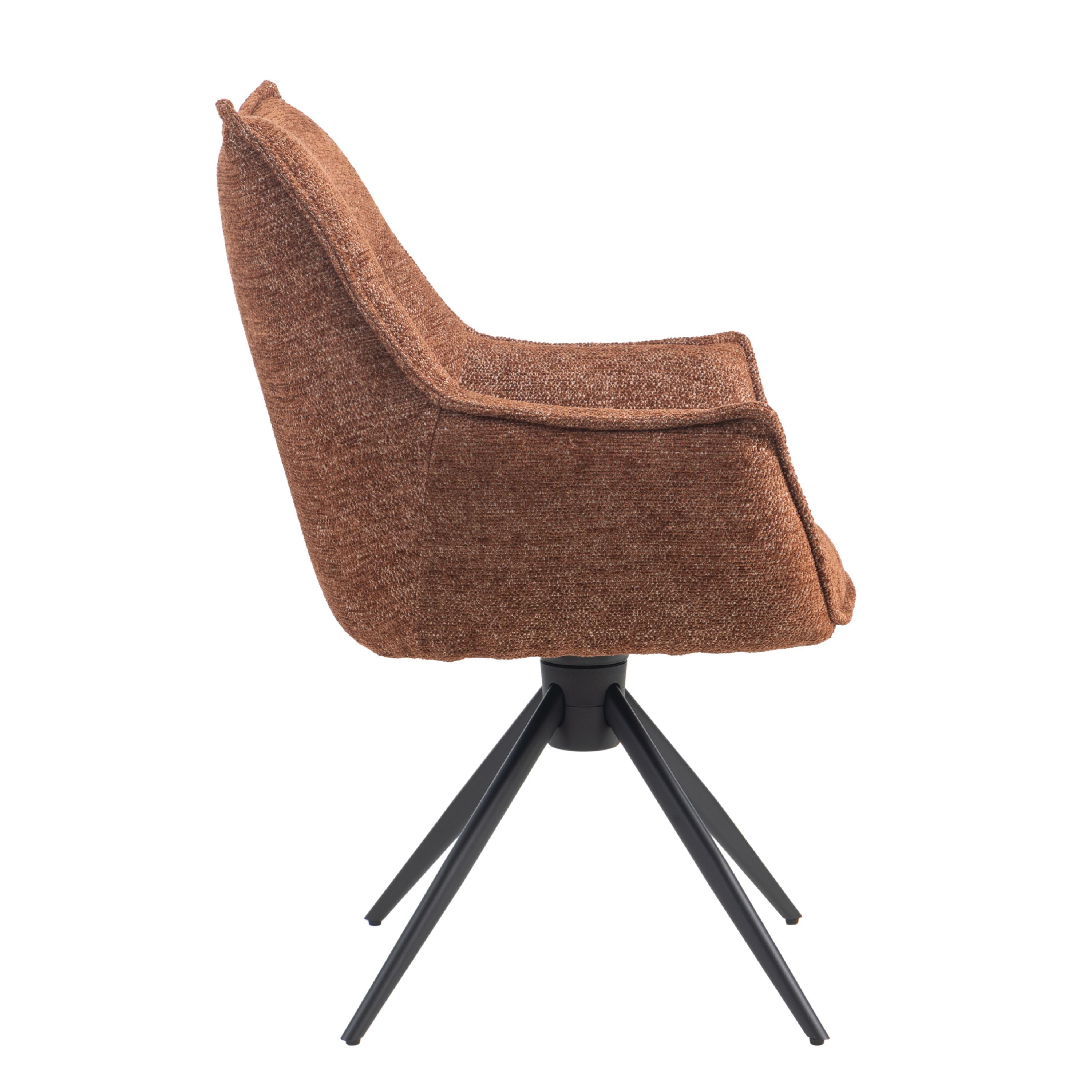 Eetkamerstoel Floris is een moderne draaibare eetkamerstoel met zachte geweven stof, comfortabele vulling en zwarte stalen draaipoten. 180° draaibaar en verkrijgbaar in Beige, Groen en Tan/Terracotta.