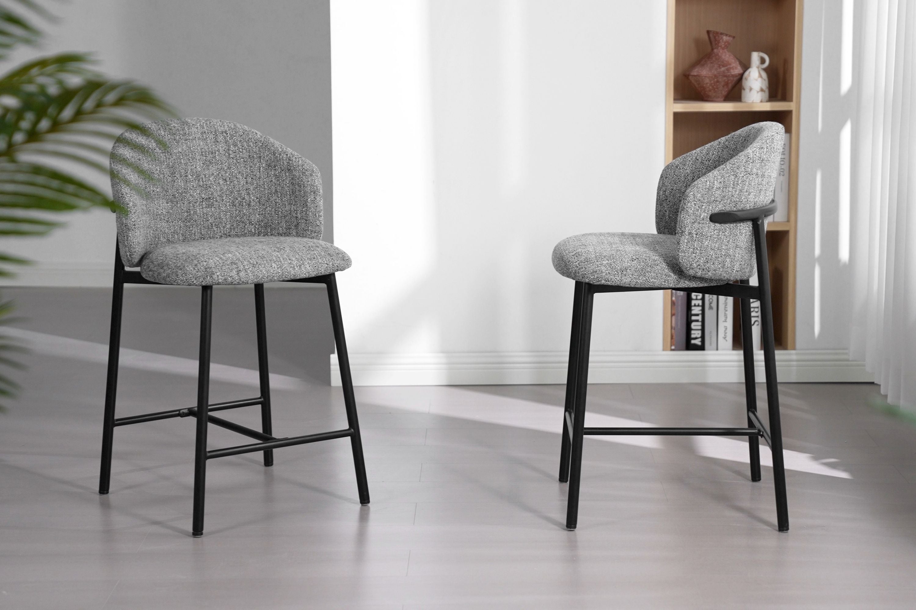 Barstoel Jenna (65 cm) brengt Japandi design en warm chenille comfort naar je keukeneiland. Verkrijgbaar in beige, bruin en grijs, met vloervriendelijke vilten dopjes. Perfect voor elk modern interieur. Lees meer