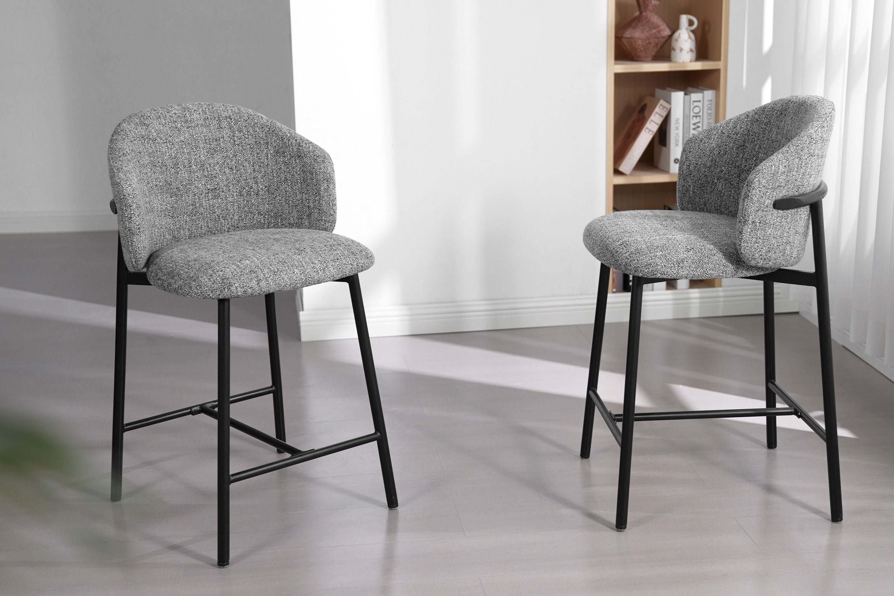 Barstoel Jenna (65 cm) brengt Japandi design en warm chenille comfort naar je keukeneiland. Verkrijgbaar in beige, bruin en grijs, met vloervriendelijke vilten dopjes. Perfect voor elk modern interieur.