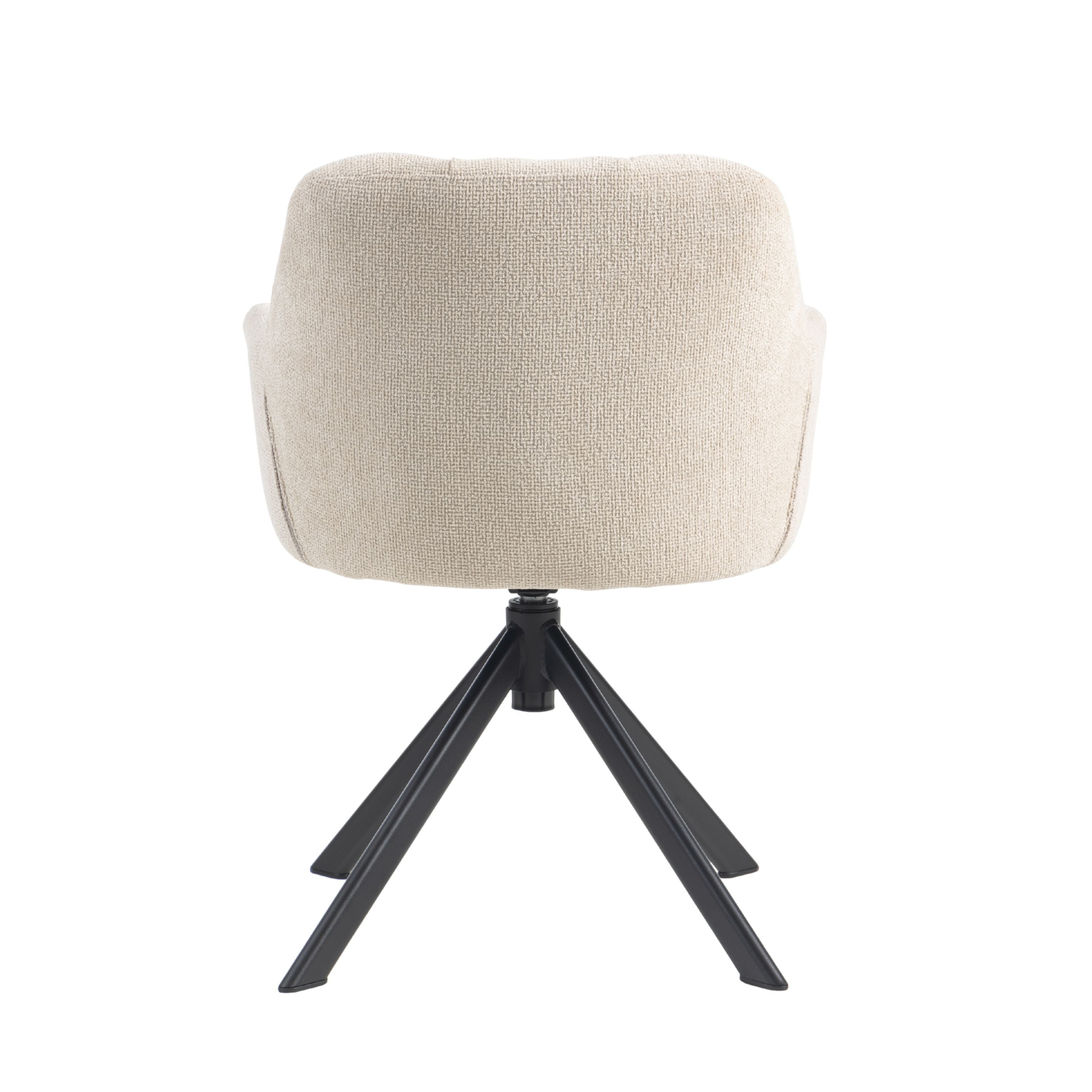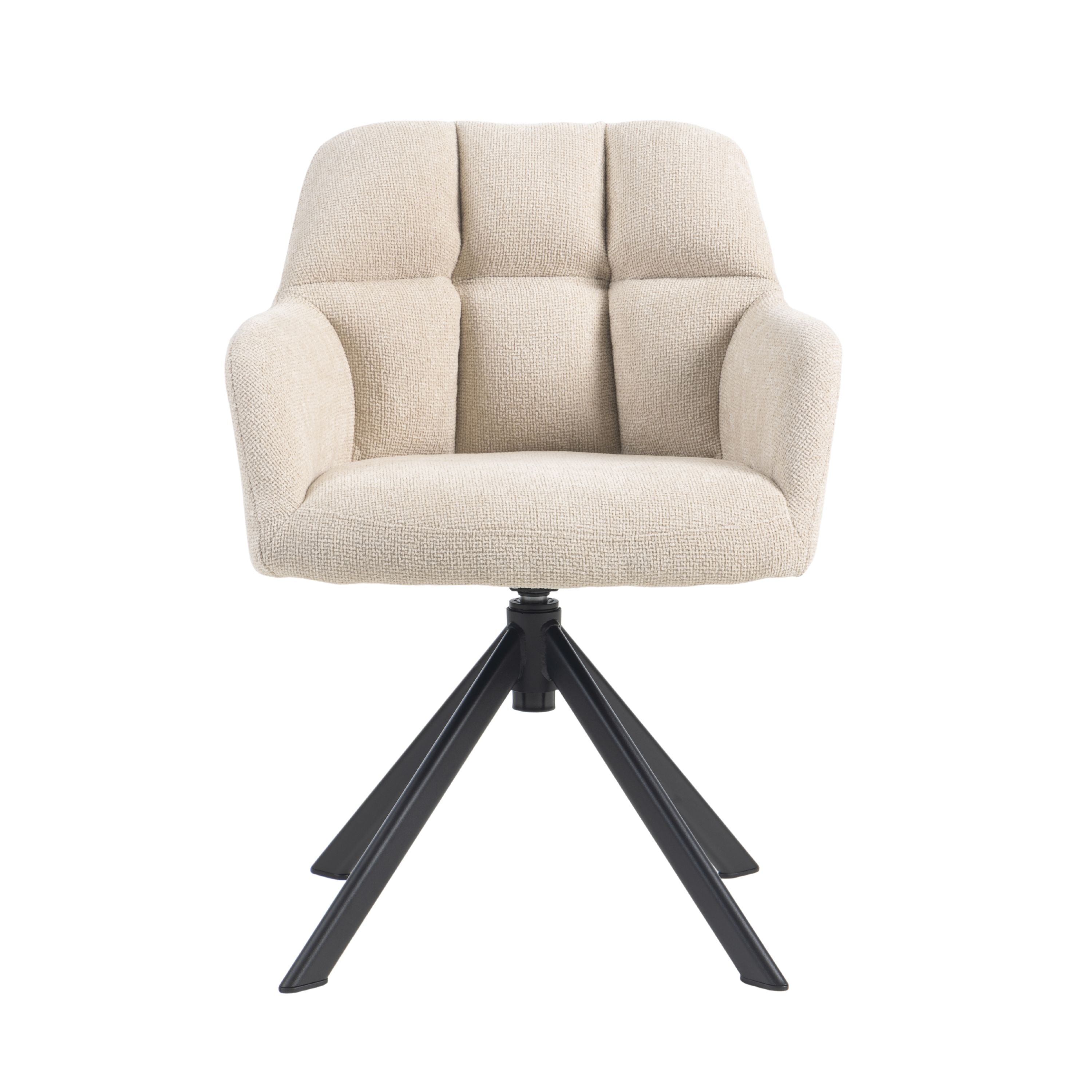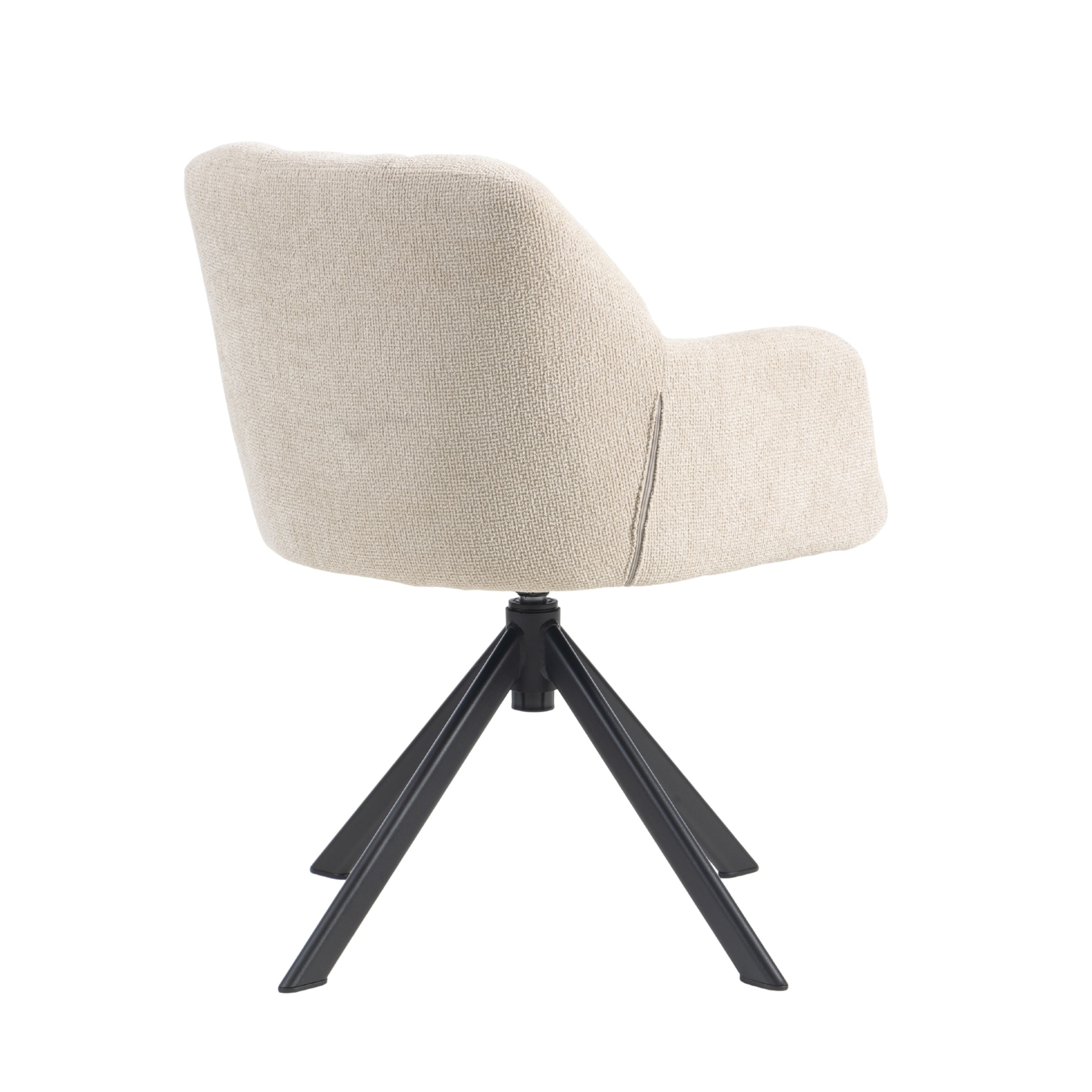Eetkamerstoel Tess is een moderne, comfortabele eetkamerstoel met een zachte geweven stof, geblokt stiksel op de rugleuning en een 360° draaibaar zwart stalen onderstel. Verkrijgbaar in Beige, Groen en Tan/Terracotta.