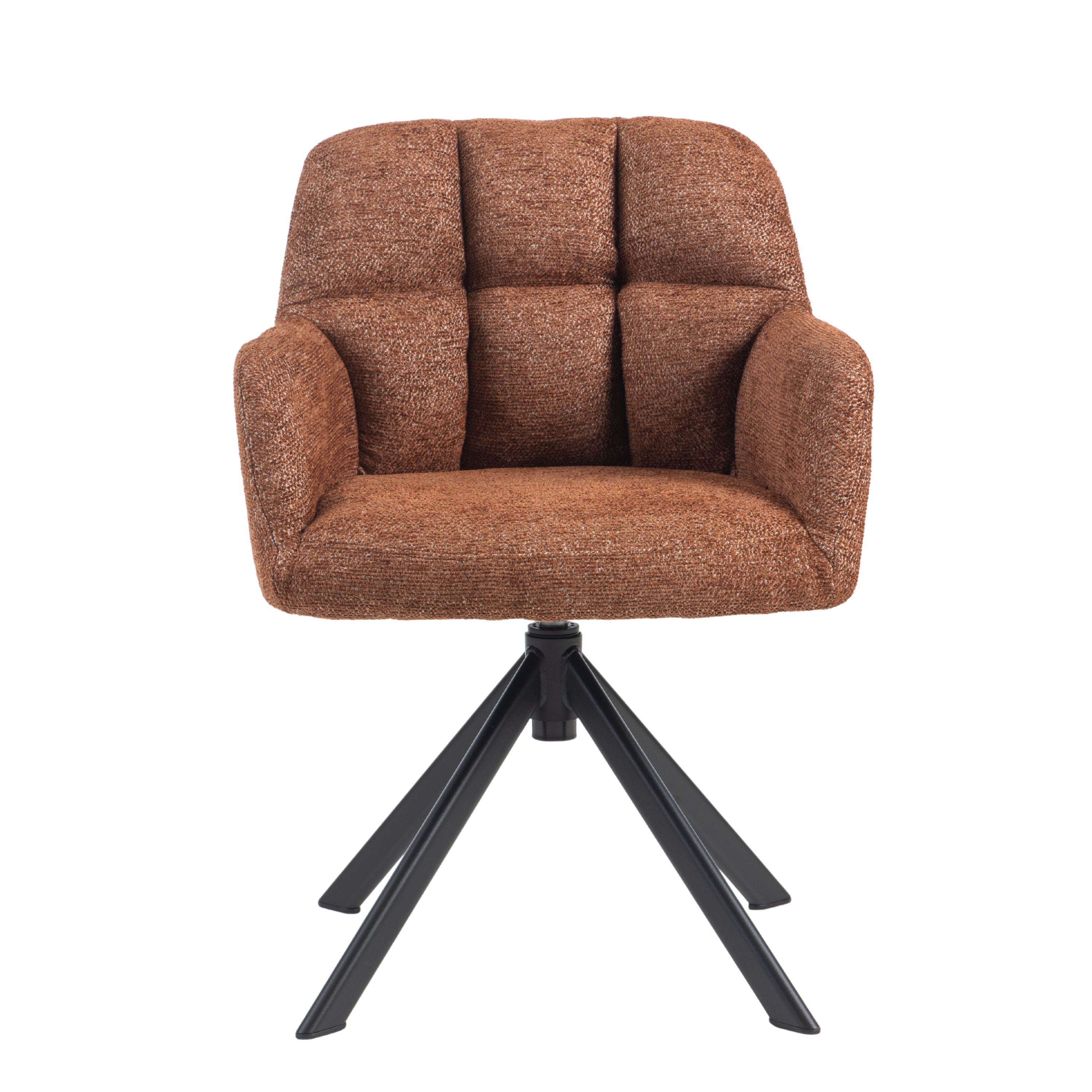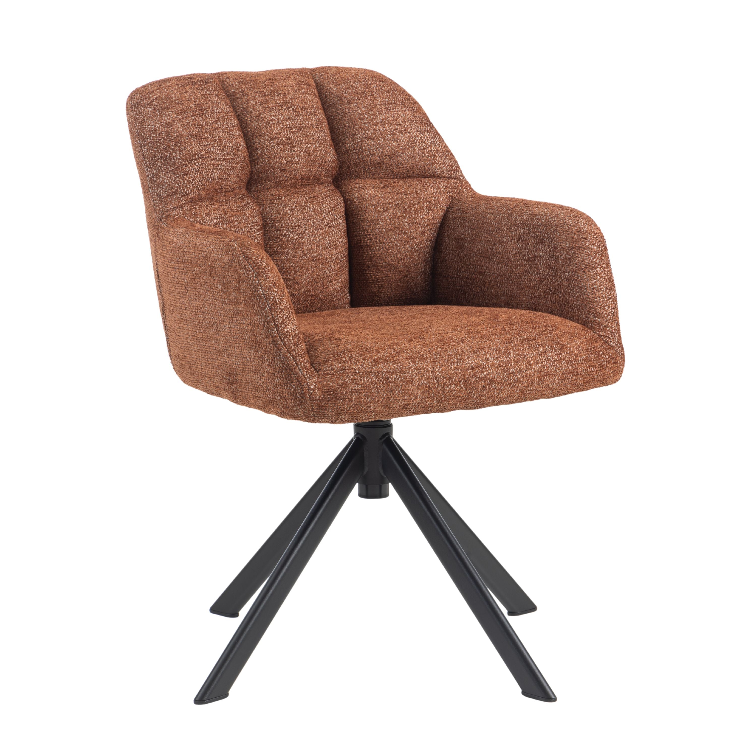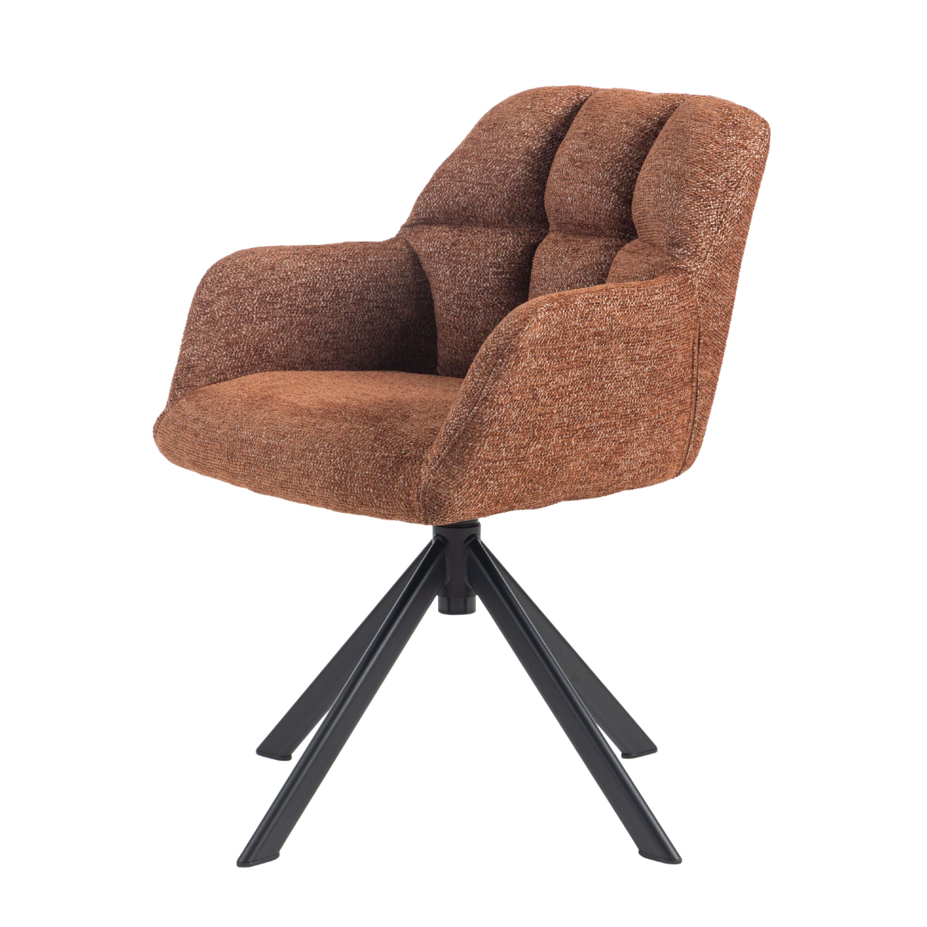 Eetkamerstoel Tess is een moderne, comfortabele eetkamerstoel met een zachte geweven stof, geblokt stiksel op de rugleuning en een 360° draaibaar zwart stalen onderstel. Verkrijgbaar in Beige, Groen en Tan/Terracotta.