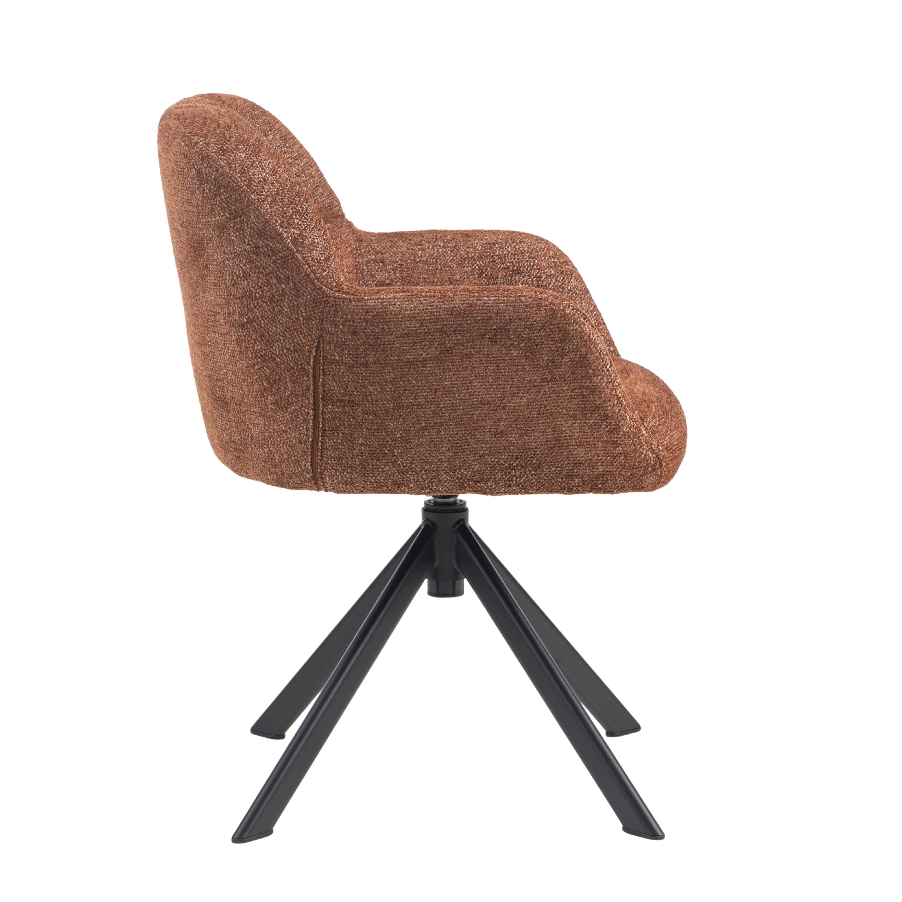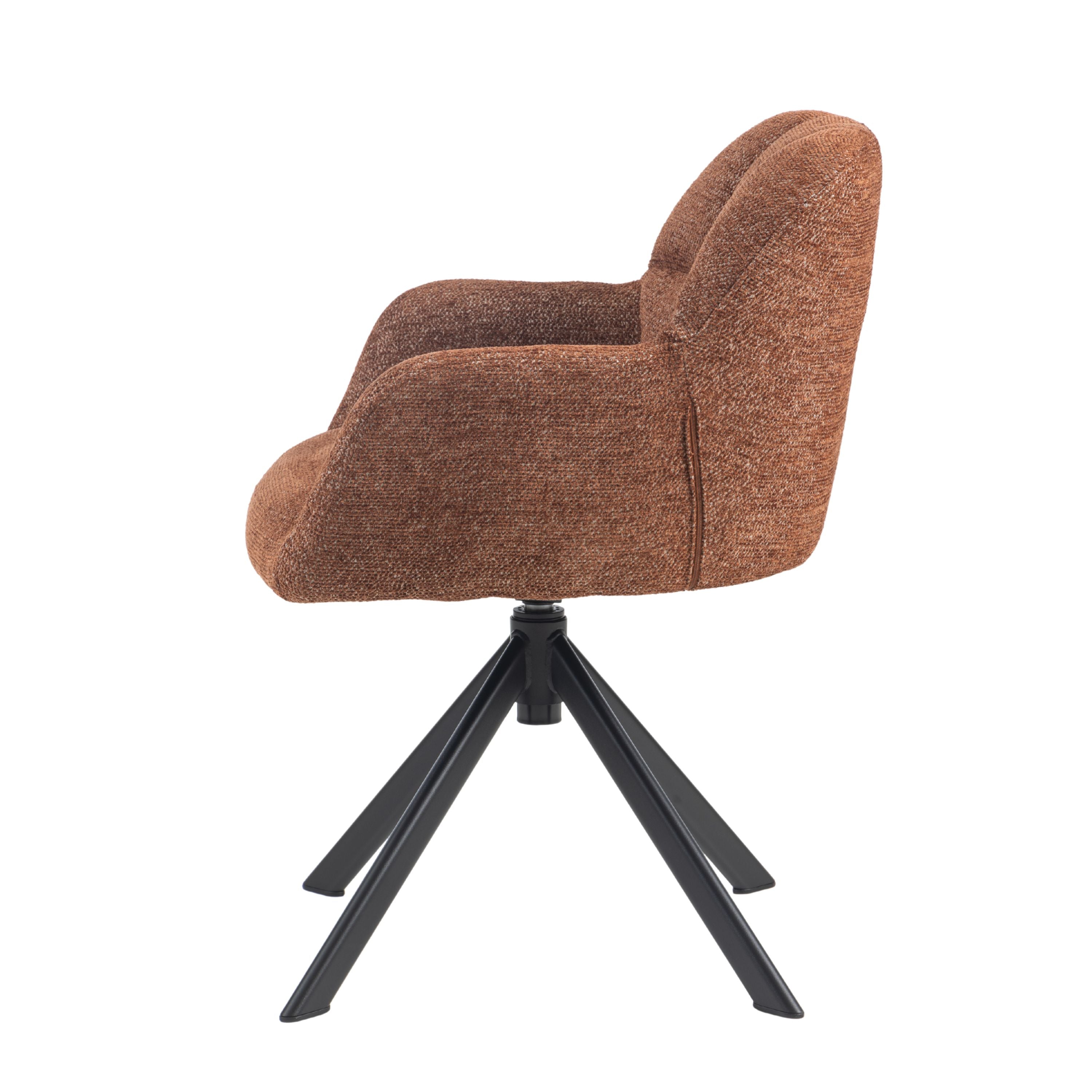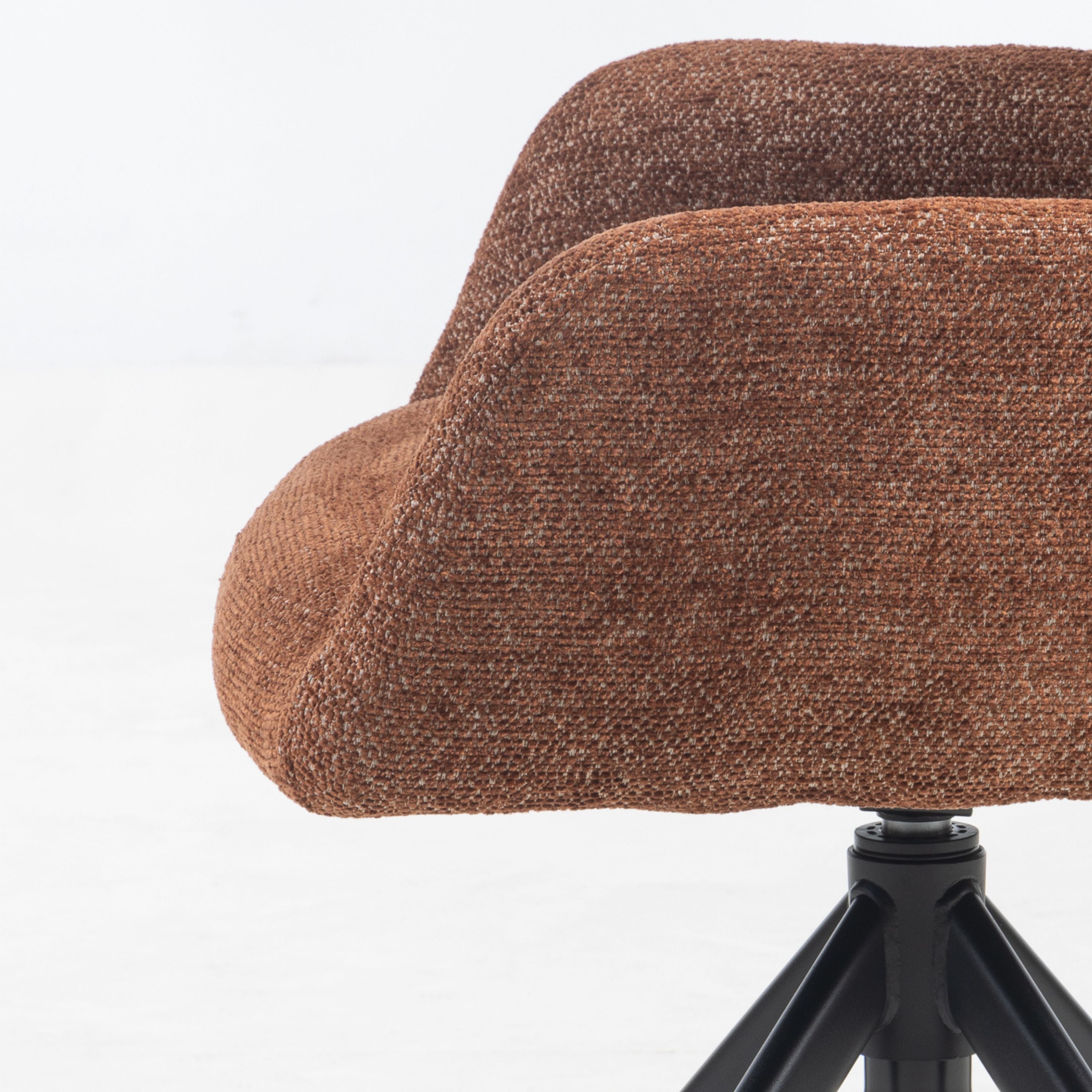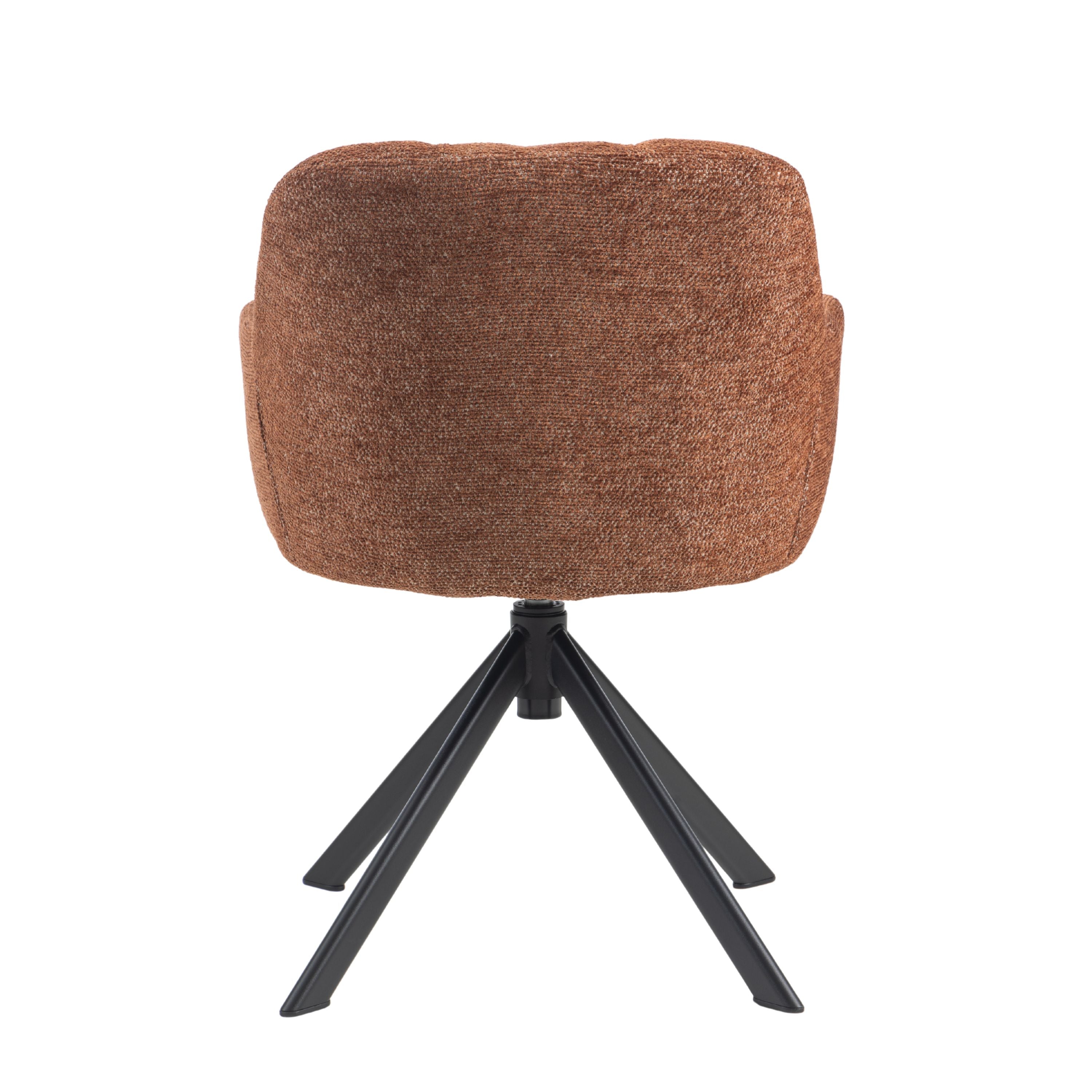 Eetkamerstoel Tess is een moderne, comfortabele eetkamerstoel met een zachte geweven stof, geblokt stiksel op de rugleuning en een 360° draaibaar zwart stalen onderstel. Verkrijgbaar in Beige, Groen en Tan/Terracotta.